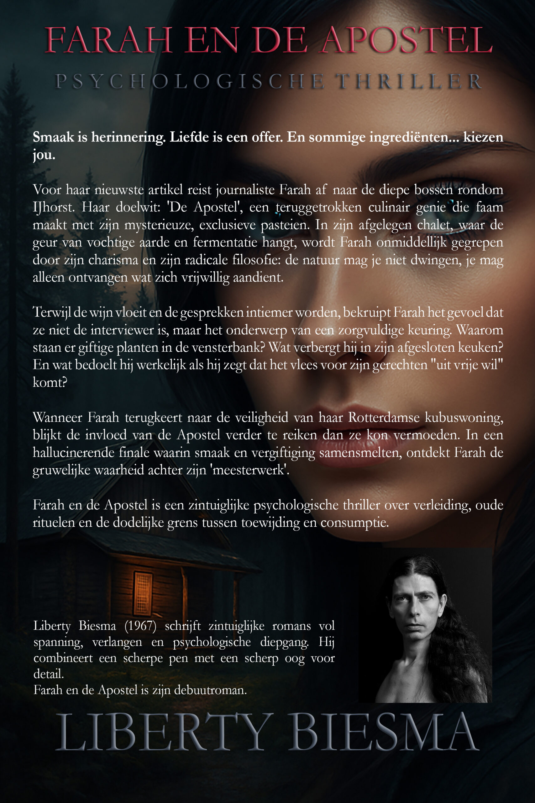 Voor haar nieuwste artikel reist journaliste Farah af naar de diepe bossen rondom IJhorst. Haar doelwit: ‘De Apostel’, een teruggetrokken culinair genie die faam maakt met zijn mysterieuze, exclusieve pasteien. In zijn afgelegen chalet, waar de geur van vochtige aarde en fermentatie hangt, wordt Farah onmiddellijk gegrepen door zijn charisma en zijn radicale filosofie: de natuur mag je niet dwingen, je mag alleen ontvangen wat zich vrijwillig aandient.